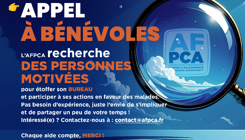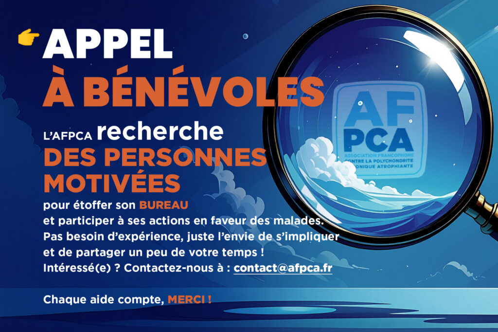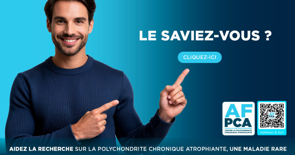 Bienvenue sur le site de l’association francophone contre la polychondrite chronique atrophiante (AFPCA). Créée le 14 mai 2007, l’AFPCA est une association à but non lucratif régie par la loi de 1901. Elle a pour objectif de faire connaître la maladie pour mieux la combattre.